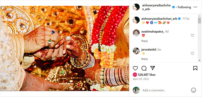 On their 17th wedding anniversary this year in April, Aishwarya picked a throwback picture from their wedding album. The photo is from their engagement ceremony. The actress simply dropped a handful of emojis in the caption.