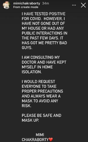 "I would request everyone to take proper precautions and always wear a mask to avoid any risk. Please be safe and mask up," Chakraborty shared in her Instagram story.