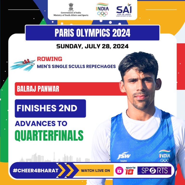 Balraj Panwar keeps medal hopes alive, finishes second in repechage round of men's singles sculls quarterfinals