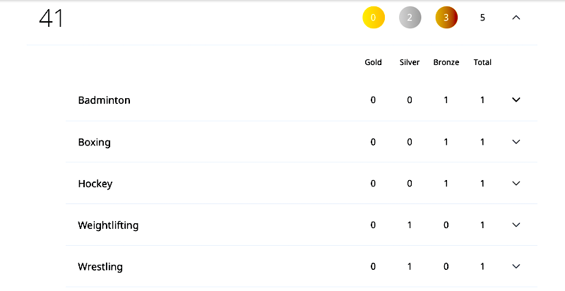 INDIA MEDAL TALLY: Won five medals so far ranking at 41