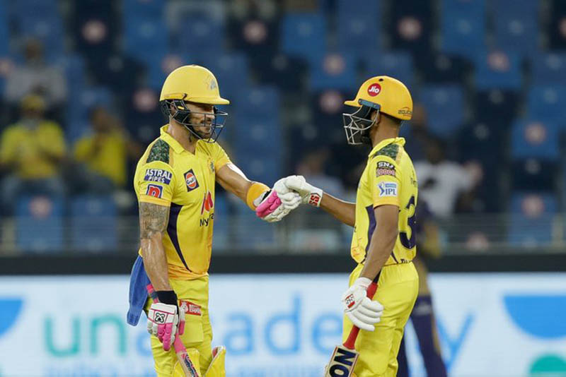 Ruturaj Gaikwad (32*) and Faf du Plessis (27*) are currently at the crease.