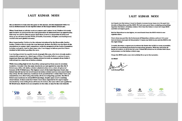"I have done my part for the betterment of Rajasthan cricket, and now it is your turn to honor your part of the promise! I repose my faith in you and the BCCI to do the right thing" he added.