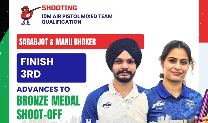 India's medal hope continues with bronze medalist shooter Manu Bhaker and Sarbajot Singh qualifying for the bronze medal match at Monday's 10m air pistol mixed team event of the ongoing Paris Olympics 2024.