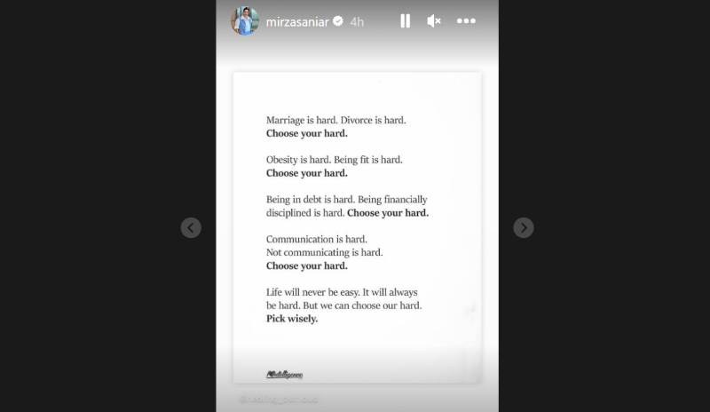Just days ago, Sania sparked a fresh rumour of her divorce with Malik with a cryptic Instagram post where she said, "Marriage is hard. Divorce is hard. Choose your hard. Obesity is hard. Being fit is hard. Choose your hard. Being in debt is hard. Being financially disciplined is hard. Choose your hard.