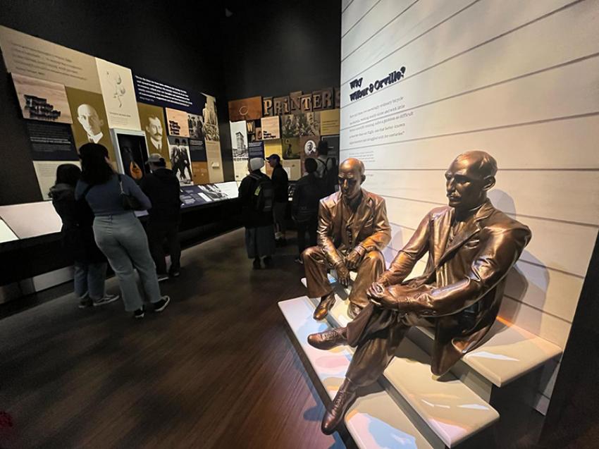 A visitor's world of wonderment starts at the Wright Brothers & The Invention of the Aerial Age gallery where two bronze statues of the genius duo sitting on the steps welcome you.