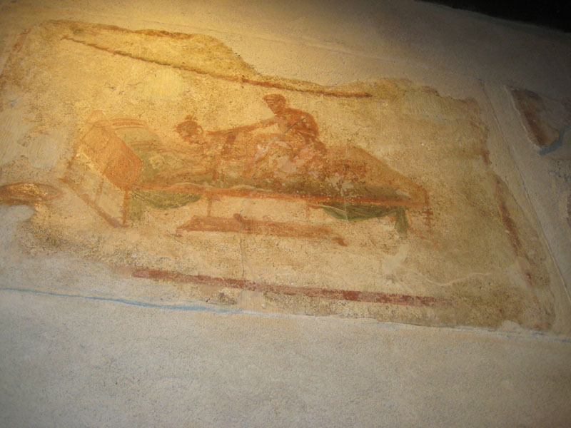 The huge hall where the fish and meat market was located show faded paintings with fishmongers and a lively market scene. You can also see where the wool market was located. The bakeries’ ovens look similar to the old brick stone oven seen even today in some rural areas. At the ‘House of the Baker’ there is a garden with millstones of lava used for grinding the wheat.
