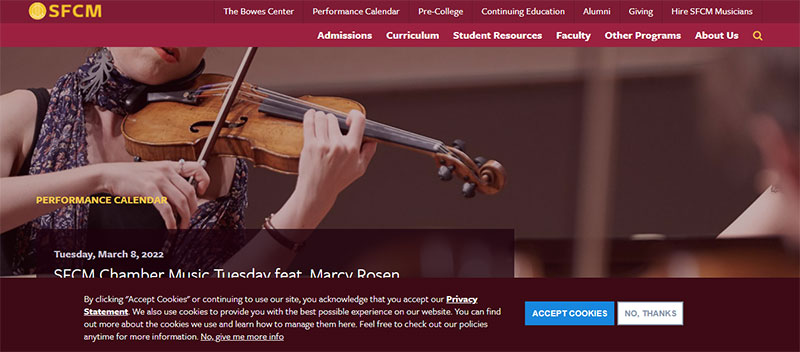 The new 12-story, white and glass building designed by Mark Cavagnero Associates is located across from Davies Symphony Hall, one block south of City Hall. A new hub for music and collaboration, the Bowes Center is a “vertical campus” where students can create, learn, and share music. It features a glassed-in performance space overlooking City Hall’s dome and other performance spaces that can be seen by passersby on the street. Visit https://sfcm.edu/performance- calendar for more information.
