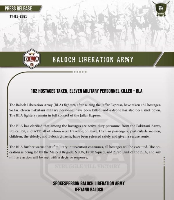 "Any military incursion will be met with an equally forceful response. So far, six military personnel have been killed, and hundreds of passengers remain under BLA custody. The Baloch Liberation Army takes full responsibility for this operation," the BLA spokesperson said in the statement shared on social media.
