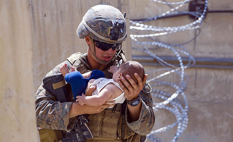 A US Marine assigned to the 24th Marine Expeditionary Unit (MEU) comforts an infant while they wait for the mother during processing at Hamid Karzai International Airport in Kabul, Afghanistan on Monday./Image; UNI