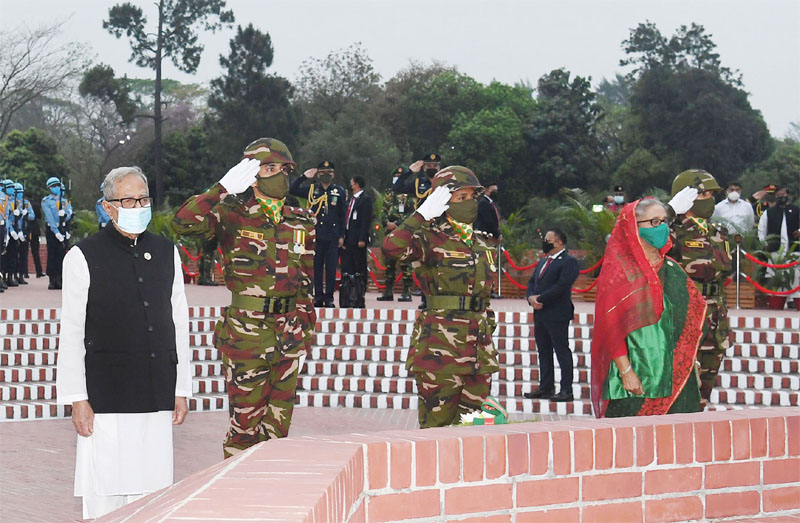 The leaders also signed the visitors' book at the National Mausoleum. Bangabandhu Sheikh Mujibur Rehman's other daughter Sheikh Rehana, Jatiya Sangsad Speaker Shirin Sharmin Chaudhury, Chief Justice Hasan Foez Siddique, senior Awami League (AL) leaders and top civil and military personnel were also present. A number of programmes will mark the National Day as Covid-19 cases have eased.