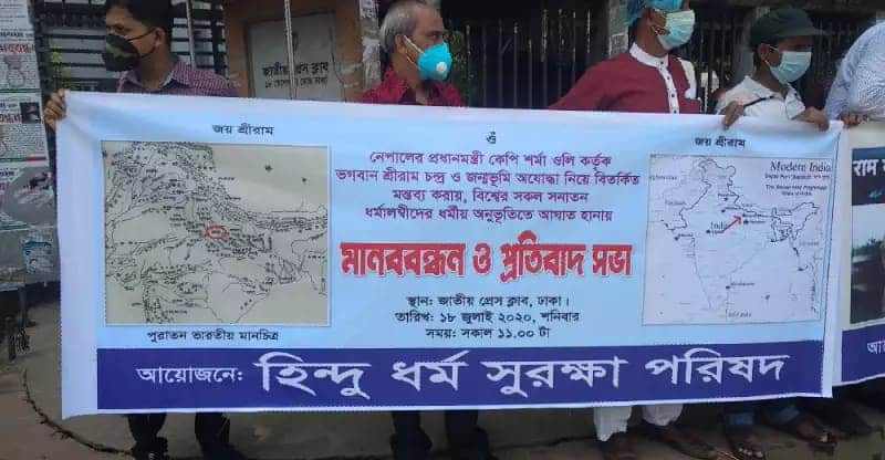 Various protest programmes were organized by different Hindu organisations in Dhaka criticizing the Prime Minister of Nepal for distorting history and mixing religion with politics.
