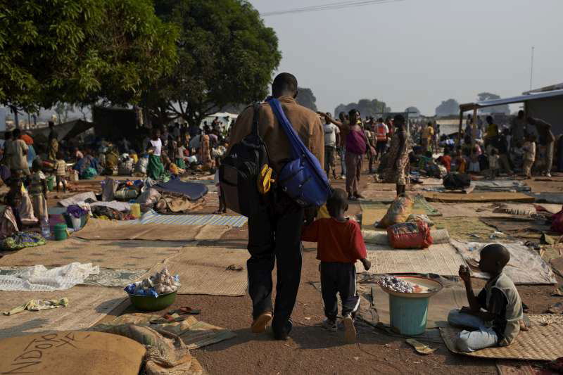 (A man and his child walk through a crowded site for internally displaced people in the Central African Republic capital, Bangui, where many people remain at risk. Photo: UNHCR/S. Phelps)