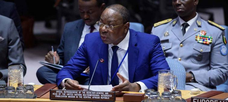 Photo caption and credit: UN Photo/Loey Felipe Mankeur Ndiaye, Special Representative of the Secretary-General and Head of the UN Multidimensional Integrated Stabilization Mission in the Central African Republic (MINUSCA), brief Security Council members on the situation in the Country.