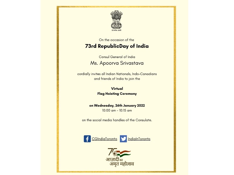 Toronto/IBNS: The Consulate General of India, Toronto office will be virtually celebrating the 73rd Republic Day of India at 10 am on Jan 26 at its premises.