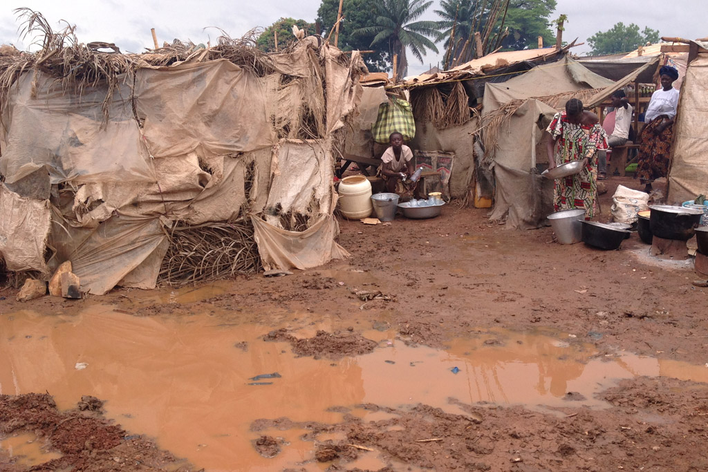 (Water stagnates amidst tents and shelters following early-season rainfalls at the displacement site at Bangui's international airport in the Central African Republic. Photo: OCHA/Laura Fultang)