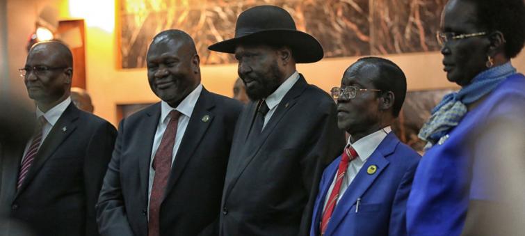 Salva Kiir, President of South Sudan, (centre right) shakes hands with Riek Machar, who was sworn in as First Vice President of the new Transitional Government of National Unity on 22 February 2020.