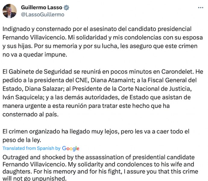 "Organised crime has come a long way, but the full weight of the law will fall on them,” Lasso said as he declared a state of emergency for 60 days.