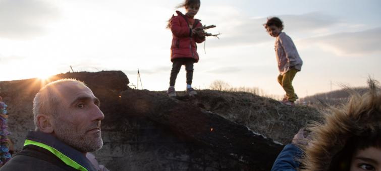 Photo caption and credit: ©IOM/Emrah Özesen A Syrian family prepares to huddle down by a fire out of the wind while children gather branches to burn, as they deliberate how to get home after a failed crossing attempt at the Edirne border with Greece.