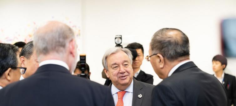 Photo caption and credit: UN Japan/Ichiro Mae. UN Secretary-General António Guterres at the G-20 summit in Japan in 2019. He is shown at the Climate Change Trilateral Meeting with HE Mr. Jean-Yves Le Drian, Foreign Minister of France and HE Mr. Wang Yi, Foreign Minister of China