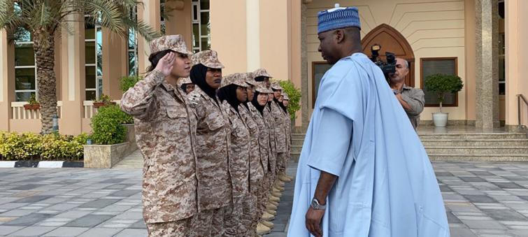 UN General Assembly President Tijjani Muhammad-Bande meets cadets participating in a military and peacekeeping training programme at Khawla bint Al Azwar Military Academy for Women in Abu Dhabi.