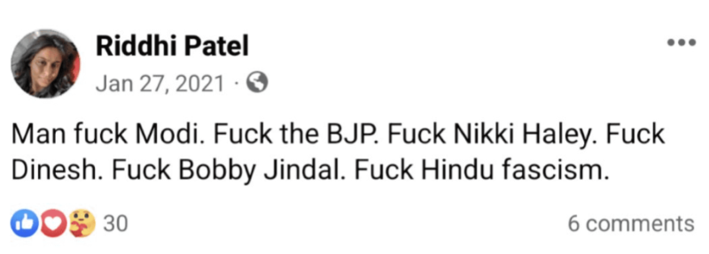 On January 21, Patel posted on Facebook, "Man f**k Modi. F**k the BJP. F**k Nikki Haley. F**k Dinesh. F**k Bobby Jindal. F**k Hindu Fascism."