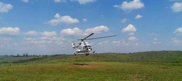 A helicopter form the UN peacekeeping mission in the Democratic Republic of the Congo touches down in Djugu in Ituri province in December 2019.