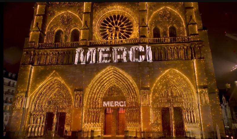 Notre Dame’s lighting display, featuring the word "thank you" in multiple languages, paid tribute to the engineers, carpenters, and artisans who dedicated years to restoring the cathedral, said the report.