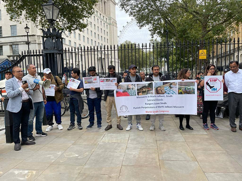 The World Sindhi Congress (WSC) expressed solidarity with the ongoing struggle against the Marhi Jalbani Massacre in Sindh by holding a protest on on Sunday opposite 10 Downing Street, the residence of the UK Prime Minister.