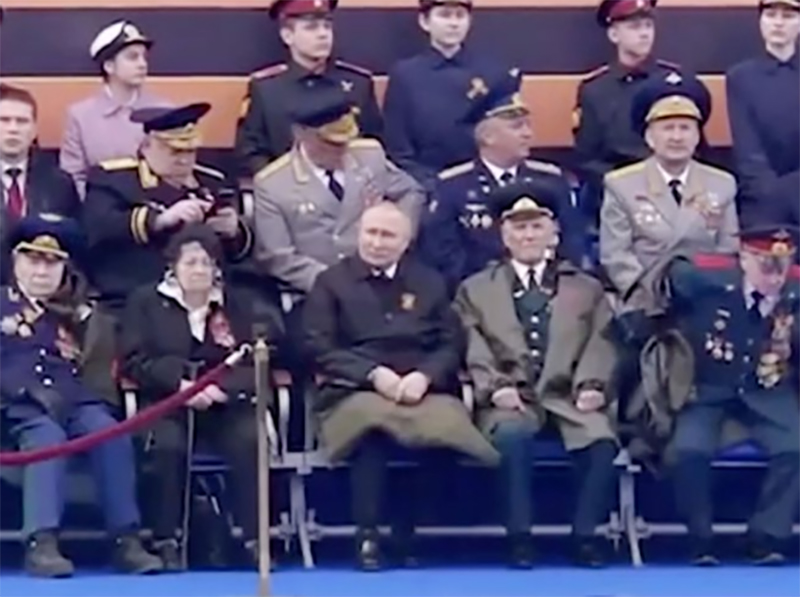 "The tough guy" #Putin is the only one who shows weakness during today's parade and sits under a blanket and holds his hands! 🧸#RussiaWarCrimes pic.twitter.com/nm2wI9BT0q
