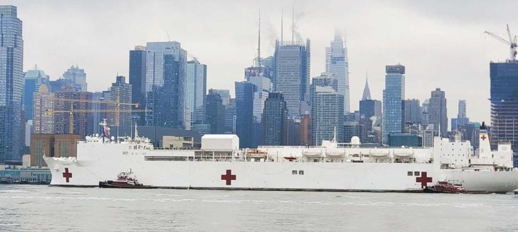 US Naval Hospital Ship Comfort arrives in New York City harbour to provide care for non-coronavirus patients freeing up beds in hospitals across the city.