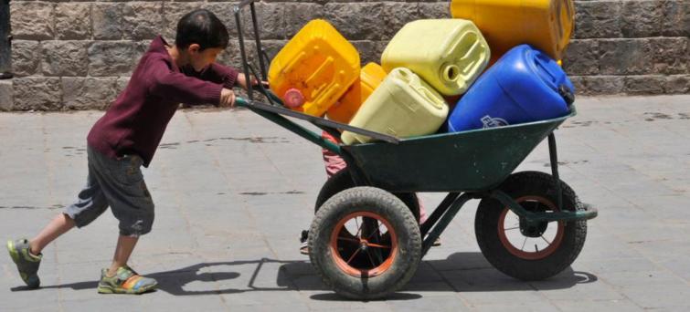 A boy pushes a wheelbarrow filled with jerrycans in Sanaa, the Yemeni, capital.