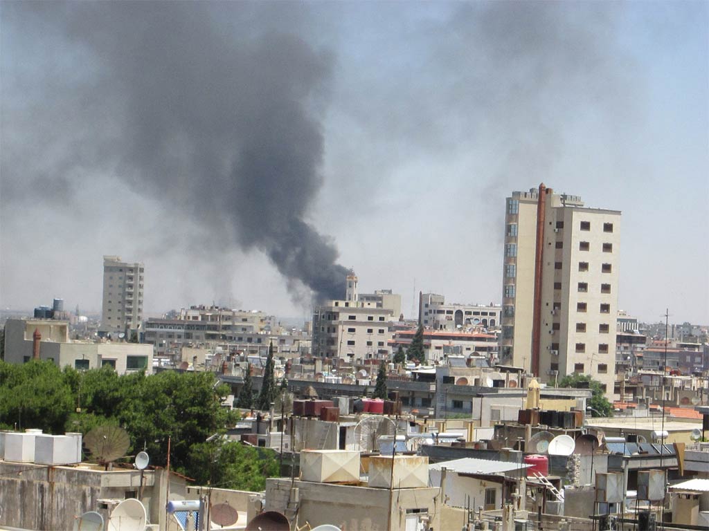 [Smoke drifts into the sky from buildings and houses hit by shelling in Homs, Syria (June 2012). UN Photo/David Manyua (file)]