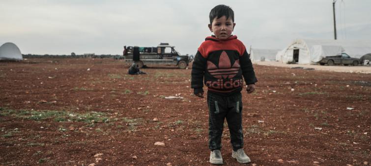 A young boy stands in a camp for people who have fled fighting in northwestern Syria.