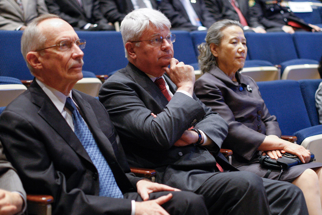 [Assistant Secretary-General for Peacekeeping Operations Edmond Mulet (left), along with Hervé Ladsous, Under-Secretary-General for Peacekeeping Operations, and Secretary-General Ban Ki-moon's wife Yoo Soon-taek at the Dag Hammarskjöld Medal Award Ceremony. UN Photo/JC McIlwaine]