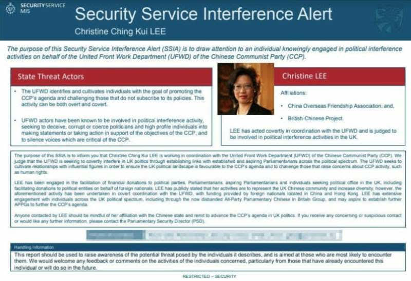 An alert from the security service said Christine Ching Kui Lee "established links" for the Chinese Communist Party (CCP) with current and aspiring MPs, reports BBC.