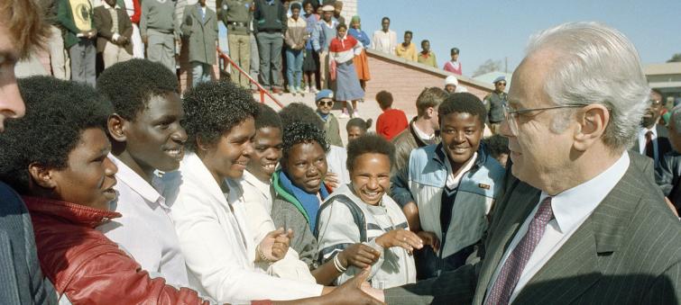 The UN Secretary-General Javier Perez de Cuellar visits Katatura, a black township of Windhoek, Namibia in July 1989.