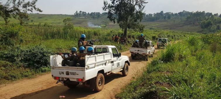 Peacekeepers from the UN Organization Stabilization Mission in the Democratic Republic of the Congo (MONUSCO) on patrol in the Irumu Territory, Ituri, to deter ADF activities.