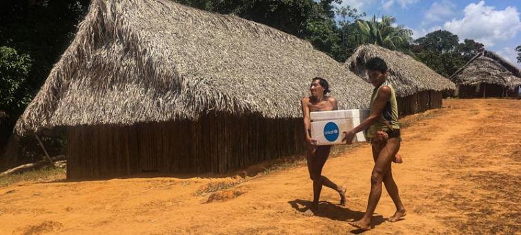 Photo caption and credit: UNICEF/Alejandra Pocaterra Two men from the Eñepa ethnic group transport vaccines to the rural outpatient clinic of San José de Kayamá, Bolivar state, Venezuela, inFebruary 2020