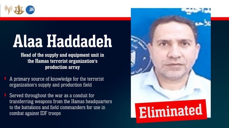 The Israeli force said Haddadeh was a central source of knowledge for supply and production systems, and operated to transfer weapons from Hamas’ headquarters to battalion and field commanders.